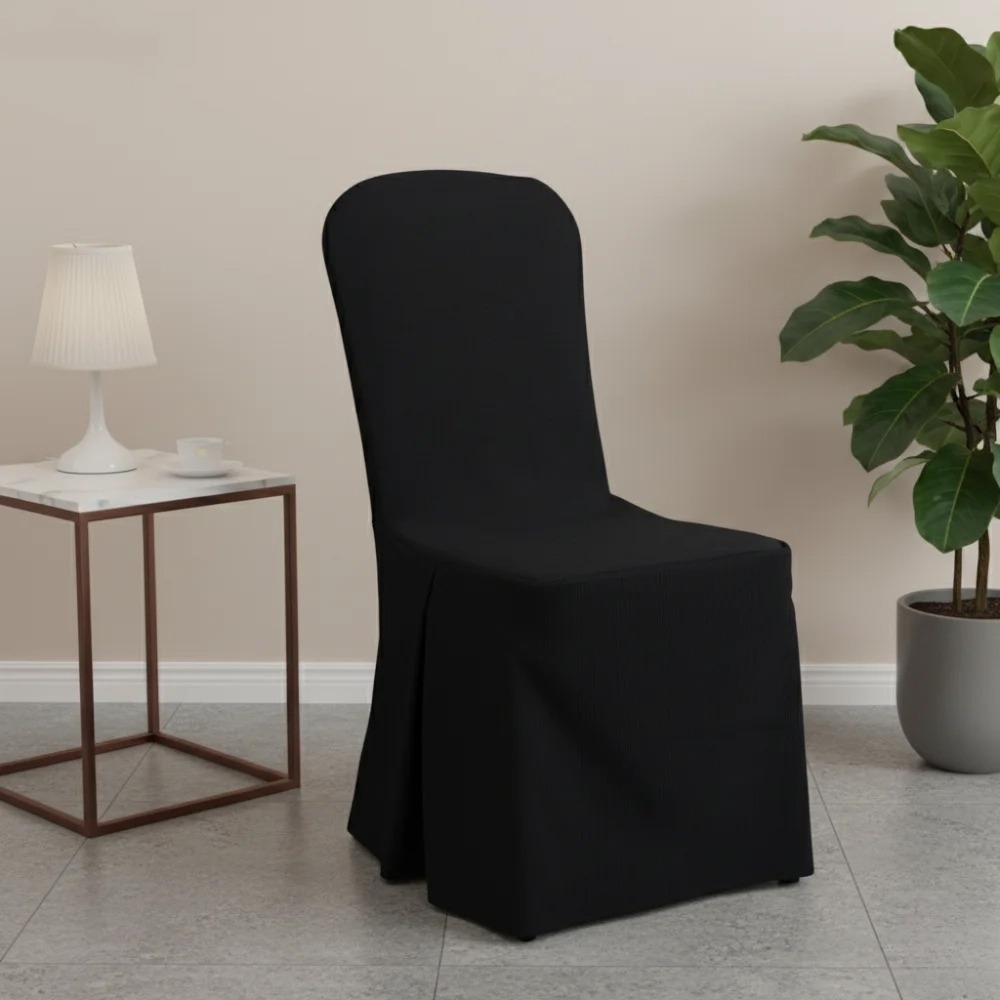 Mẫu áo ghế hội nghị màu đen được thiết kế theo kiểu phủ liền thân, ôm phần lưng và mặt ghế, phần chân áo rủ mềm giúp tổng thể ghế ngồi nhìn gọn gàng và chỉn chu hơn. Kiểu dáng này phù hợp với nhiều không gian cần sự chuyên nghiệp, đặc biệt là khu vực hội nghị, hội thảo, phòng họp, nhà hàng và khách sạn.