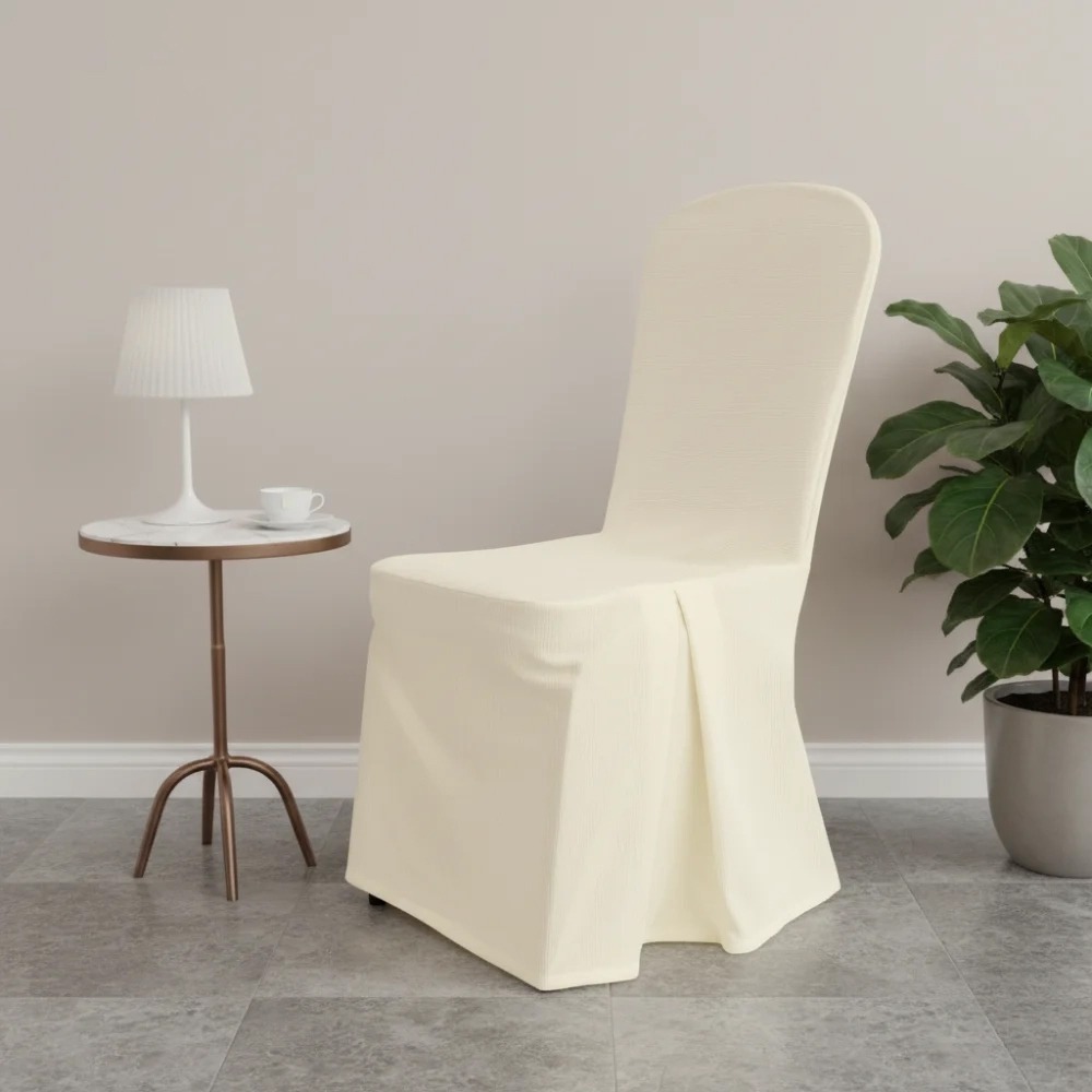 Sản phẩm có thể được gia công từ các chất liệu phù hợp với nhu cầu sử dụng trong nhà hàng – khách sạn – hội nghị như vải thun co giãn, polyester, vải Crinkle hoặc các dòng vải chuyên dùng có độ ôm ghế tốt và dễ vệ sinh. Tùy kiểu ghế và tần suất sử dụng, có thể lựa chọn chất liệu phù hợp để đảm bảo độ bền, độ rủ đẹp và sự thuận tiện trong quá trình giặt ủi.