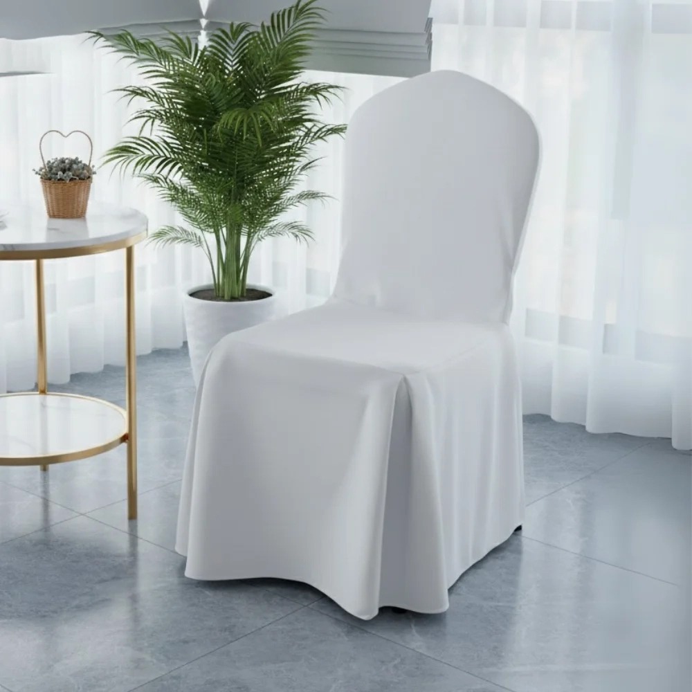 Mẫu AG01 được thiết kế theo kiểu phủ liền thân ghế, ôm phần lưng và mặt ghế, phần tà vải rủ xuống nhẹ nhàng giúp chiếc ghế nhìn mềm mại hơn. Thiết kế này phù hợp với nhiều kiểu ghế tiệc phổ biến, đồng thời hỗ trợ che phủ các bề mặt ghế cũ hoặc không đồng bộ, giúp khu vực sắp đặt trông đều và đẹp mắt hơn.