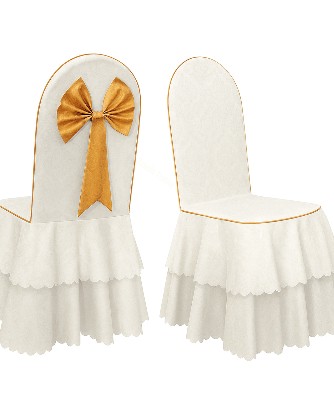 Sự kết hợp giữa nền trắng thanh lịch và nơ vàng nổi bật giúp mẫu áo ghế này phù hợp với nhiều không gian nhà hàng, khách sạn và khu vực tổ chức tiệc. Khi bố trí đồng bộ theo số lượng lớn, sản phẩm giúp khu vực ghế ngồi trở nên sáng hơn, sang hơn và tạo ấn tượng tốt hơn về mặt hình ảnh trong mắt khách hàng.
