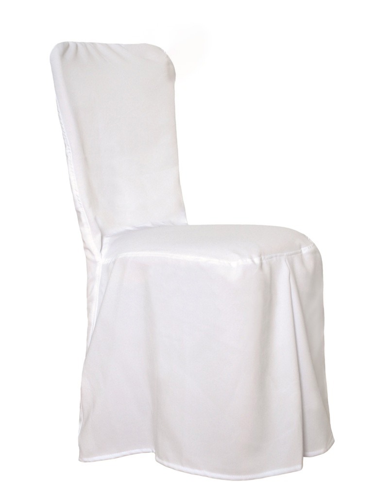 Mẫu áo ghế tiệc cưới màu trắng chân rủ mềm được thiết kế theo kiểu phủ liền thân, ôm phần tựa lưng và mặt ghế, phần chân áo buông thẳng tự nhiên giúp tổng thể ghế ngồi nhìn mềm mại và gọn gàng hơn. Kiểu dáng này phù hợp với nhiều không gian cần sự đồng bộ, đặc biệt là khu vực sảnh cưới, phòng tiệc, nhà hàng, hội nghị hoặc khách sạn.
