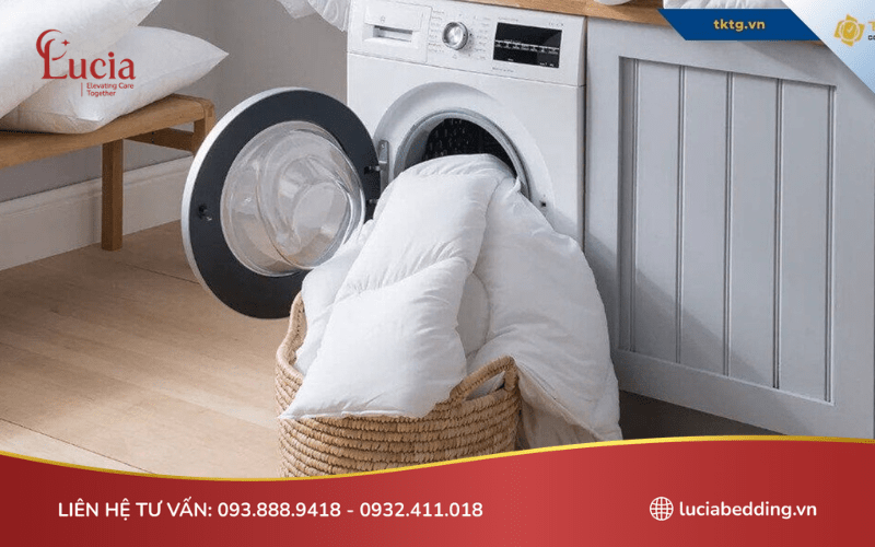 Không phải tất cả topper đều có thể giặt máy, vì vậy bạn cần kiểm tra nhãn hướng dẫn của nhà sản xuất trước khi thực hiện. Với topper làm từ bông microfiber hoặc sợi tổng hợp, bạn có thể giặt máy ở chế độ nhẹ với nhiệt độ nước dưới 40 độ C và vòng quay thấp khoảng 600 – 800 vòng/ phút. Đồng thời sử dụng lượng nước giặt vừa phải, khoảng 30 – 50ml cho một lần giặt và tránh dùng chất tẩy mạnh. Ngoài ra, nên giặt riêng topper để tránh làm vón bông hoặc biến dạng.
