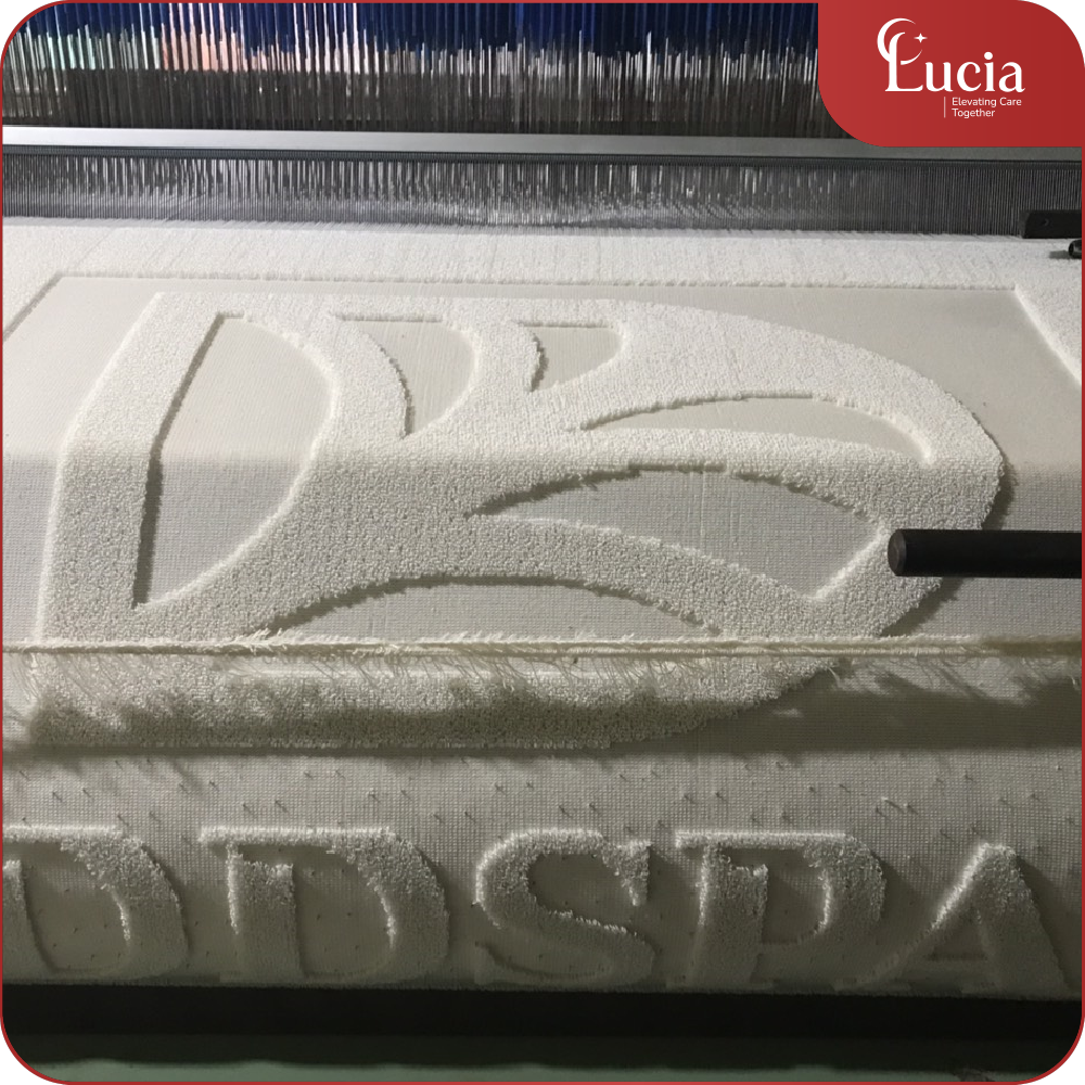- Công nghệ dệt logo sắc nét, bền màu: Lucia Bedding áp dụng công nghệ dệt logo trực tiếp trên sợi, không in, không thêu, giúp họa tiết thương hiệu nổi bật, tinh tế và không phai sau thời gian dài sử dụng.