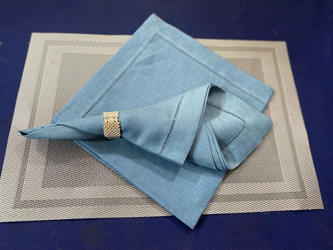 - Tên sản phẩm: Khăn napkin hội nghị màu xanh da trời phối vòng napkin sang trọng