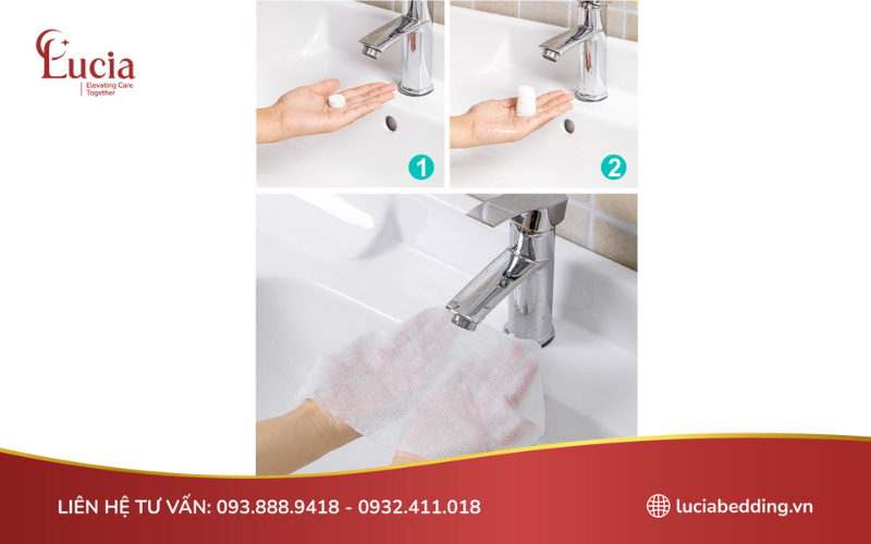 Sau khi lấy khăn ra khỏi bao bì, bạn trực tiếp nhúng khăn vào nước sạch với lượng vừa đủ. Chỉ cần vài giây, khăn sẽ tự nở ra và đạt kích thước ban đầu. Không nên ngâm quá lâu hoặc dùng nước quá nóng vì có thể làm khăn bị mất độ bền và khó thấm hút hơn.
