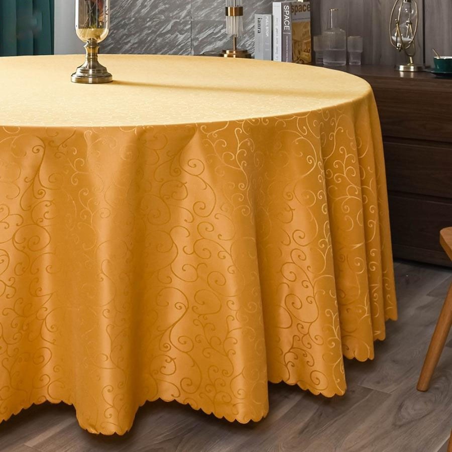 - Tên sản phẩm: Khăn trải bàn nhà hàng màu vàng hoa văn tròn phủ rủ