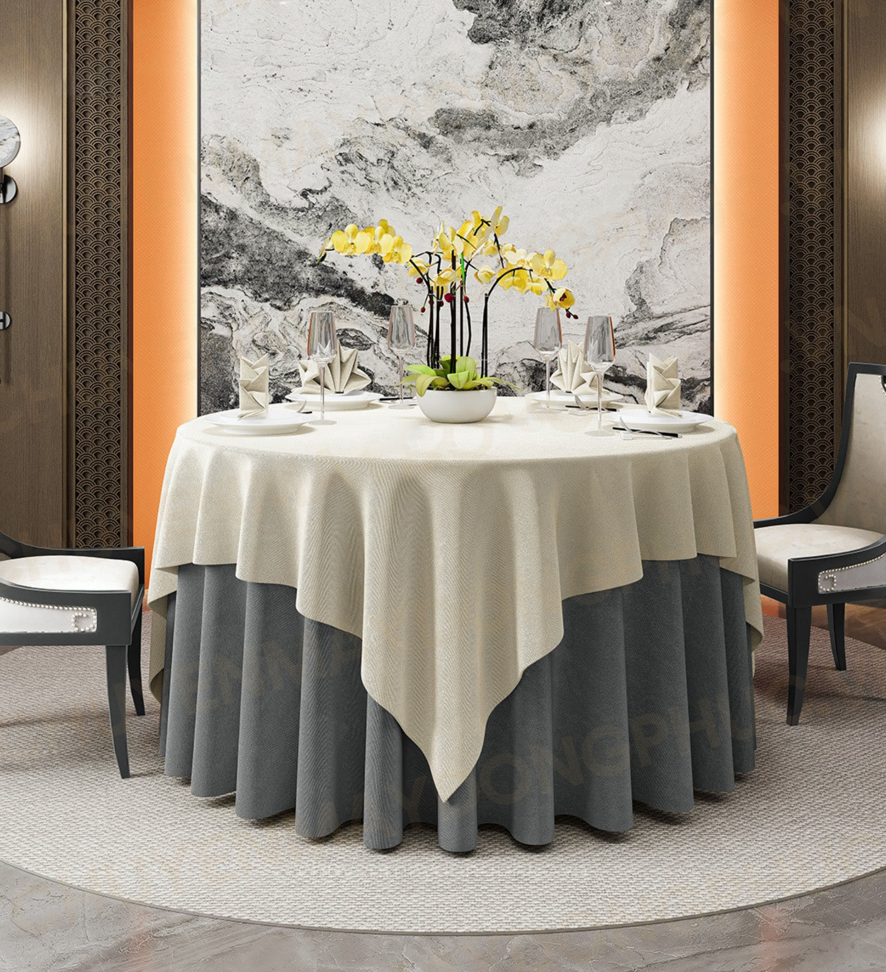 Sự kết hợp giữa gam kem và xám mang lại cảm giác nhã nhặn, dễ chịu và phù hợp với nhiều phong cách không gian khác nhau. Đây là lựa chọn thích hợp cho nhà hàng, khách sạn, khu vực tiếp khách, phòng tiệc hoặc các buổi hội nghị cần hình ảnh chuyên nghiệp nhưng vẫn giữ được sự ấm cúng và thẩm mỹ trong cách bài trí.
