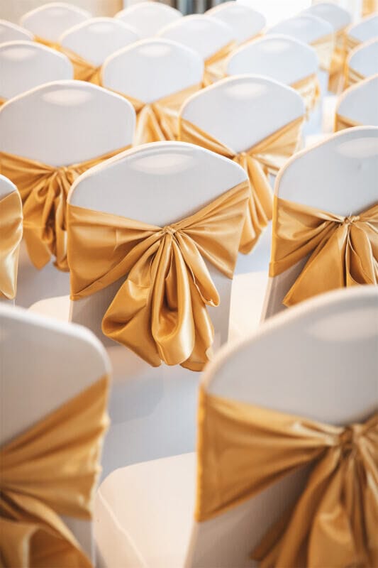 Mẫu nơ ghế hội nghị màu vàng đồng được thiết kế theo phong cách sang trọng, nổi bật với phần thắt nơ lớn phía sau lưng ghế. Khi kết hợp cùng áo ghế màu trắng hoặc các tone trung tính, sản phẩm giúp tổng thể khu vực sắp đặt trở nên bắt mắt hơn mà không cần thêm quá nhiều chi tiết trang trí khác.